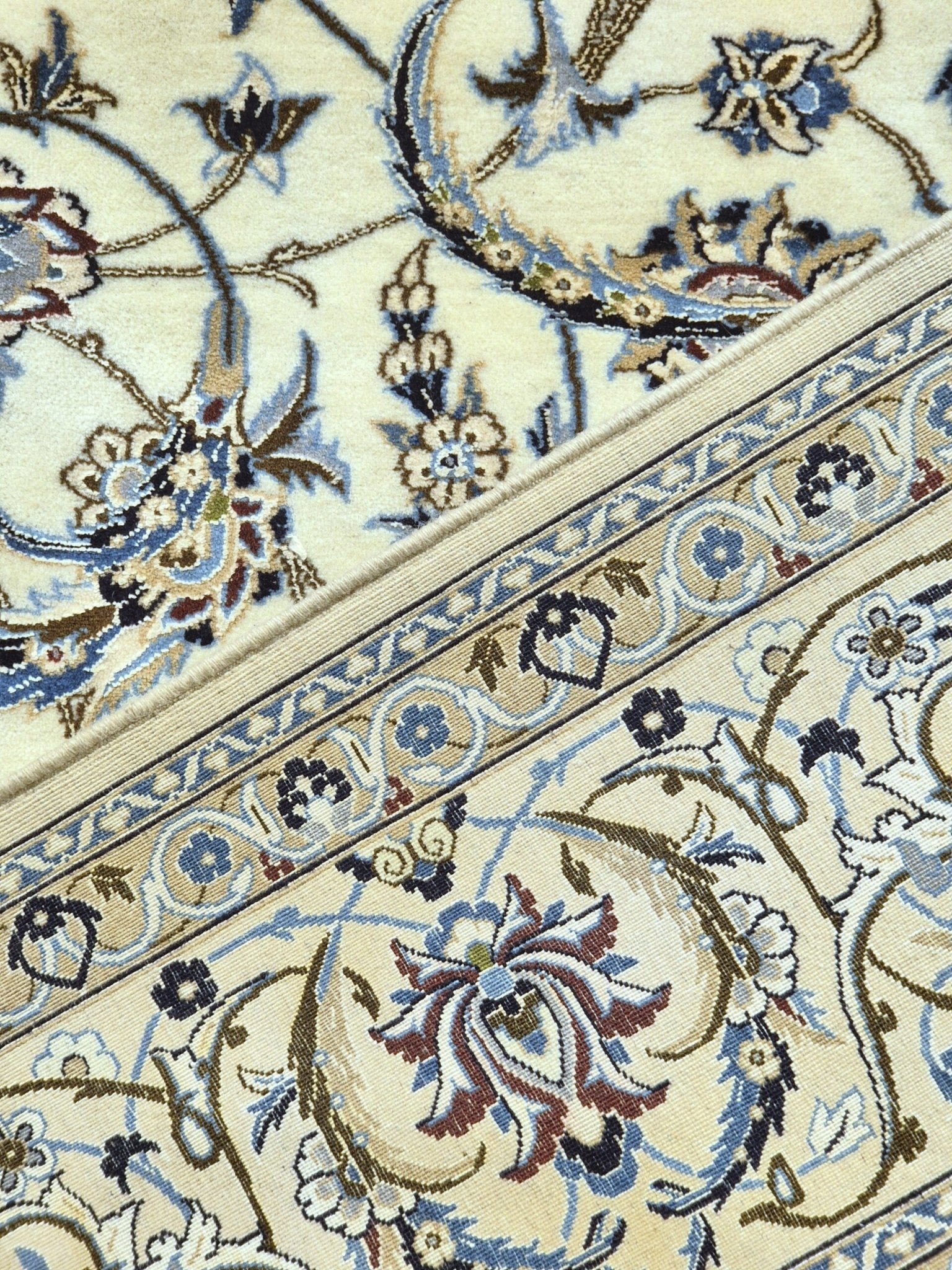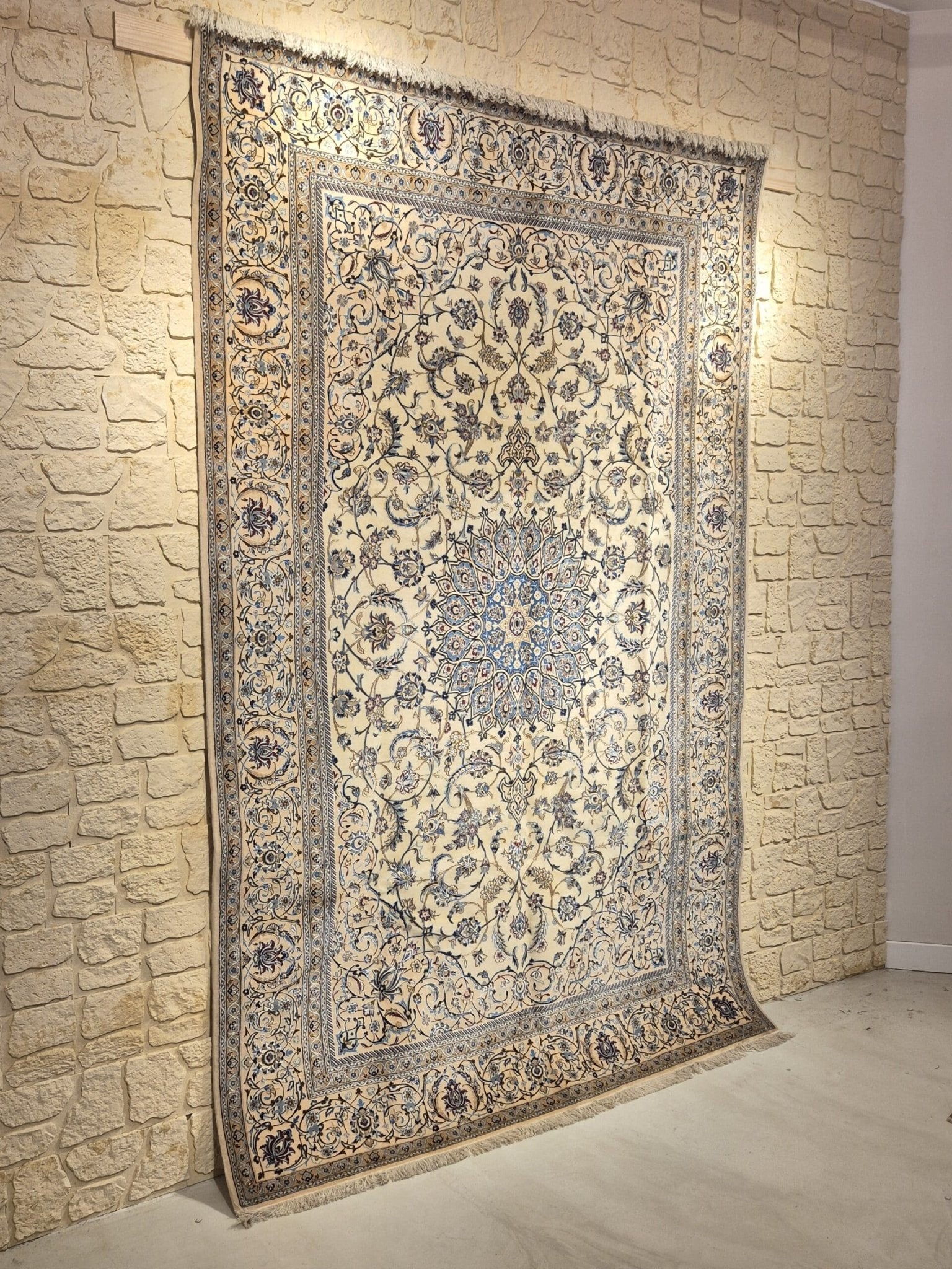 Ce tapis Naïn Shishla est tissé à la main avec de la laine de haute qualité, parfois enrichie de soie pour accentuer les détails. Cette combinaison de matières nobles confère au tapis une texture douce, résistante et un éclat raffiné.